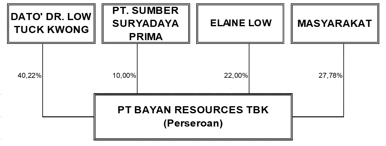 Per tanggal 31 Maret 2026, Pemegang Saham Utama dan Pengendali Perseroan secara langsung adalah Dato’ DR. Low Tuck Kwong yang memiliki sebesar 40,22% saham dari seluruh saham yang mempunyai hak suara, yang dikeluarkan oleh PT Bayan Resources Tbk. Di bawah ini adalah diagram Pemegang Saham Perseroan :